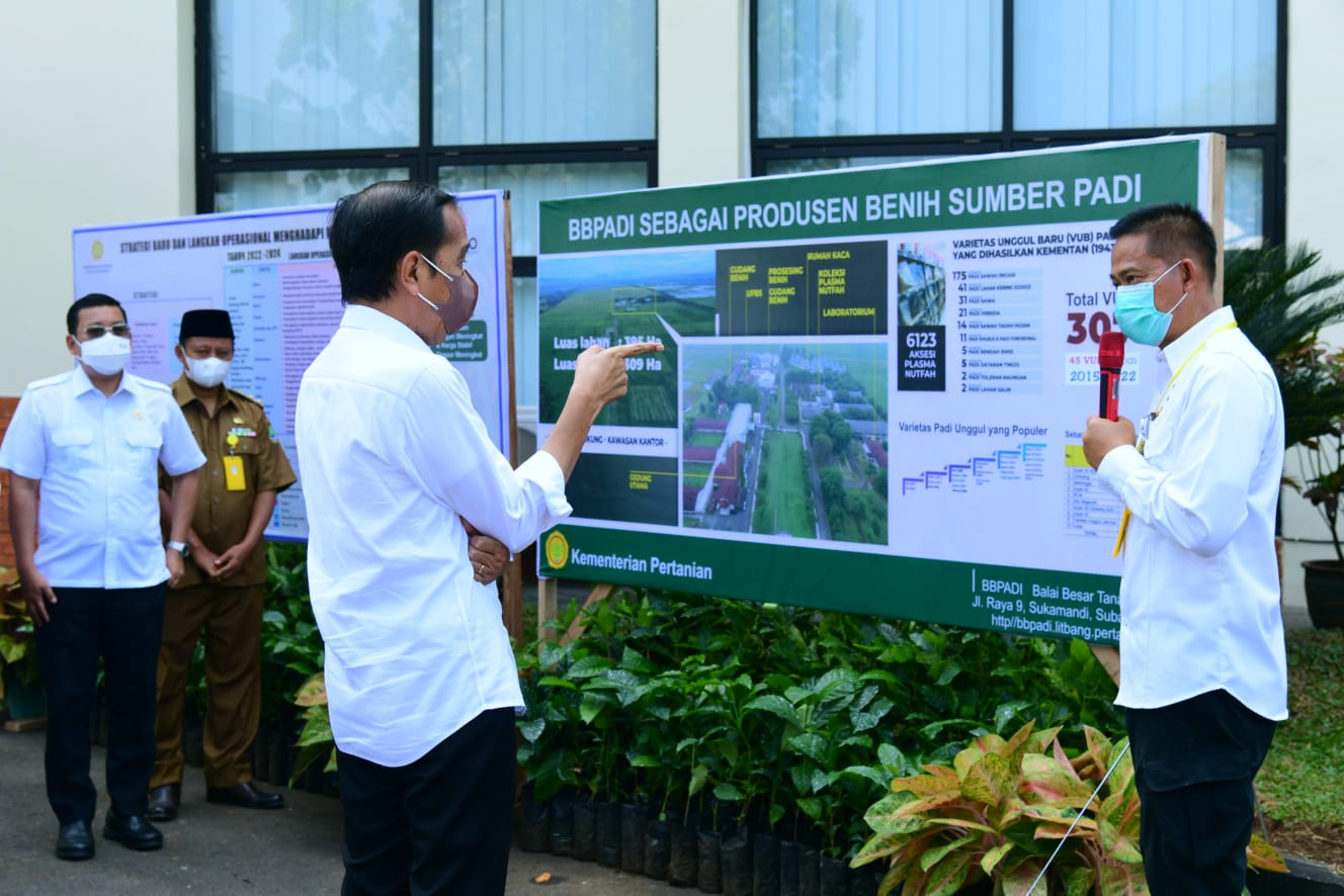 JAKARTA, iNews.id - Presiden Joko Widodo meninjau langsung Balai Besar Penelitian Tanaman Padi (BBPadi) di Kabupaten Subang, Provinsi Jawa Barat, pada Selasa, 12 Juli 2022. Kedatangan Presiden ke balai tersebut antara lain untuk memastikan ketersediaan pangan, utamanya beras di Tanah Air.