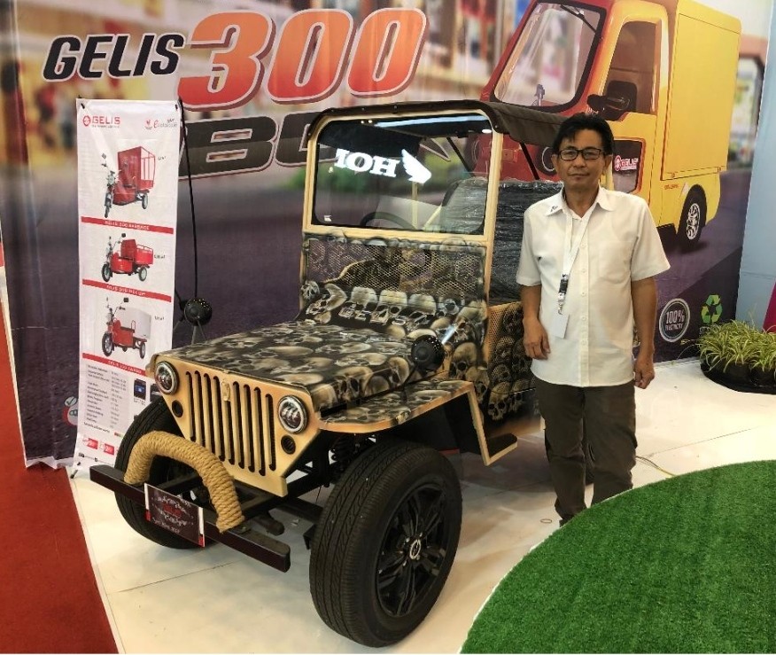 Selanjutnya ada Mini Jeep Gelis. Jeep ini basic-nya mobil tua yang populer pada perang dunia kedua. Namun kini sudah dimodifikasi dengan diganti mesin listrik. Mobil ini digerakan baterai lithium 30 ampere 48 volt. Biasanya mobil tersebut dibuat mainan arau wahana. Untuk harganya sendiri dibanderol Rp70 juta.